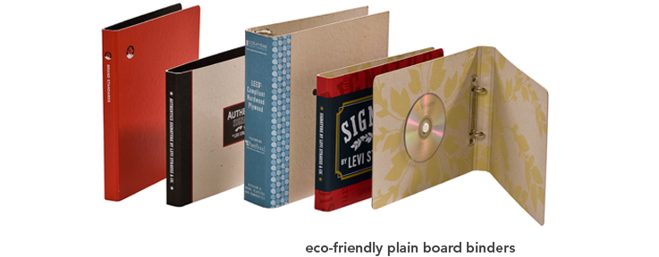 Eco-Friendly Plain Board Binders Binders are made from 100% Post Consumer graphic board. Plain Board Binders can be made to hold any sheet size and ring configuration.